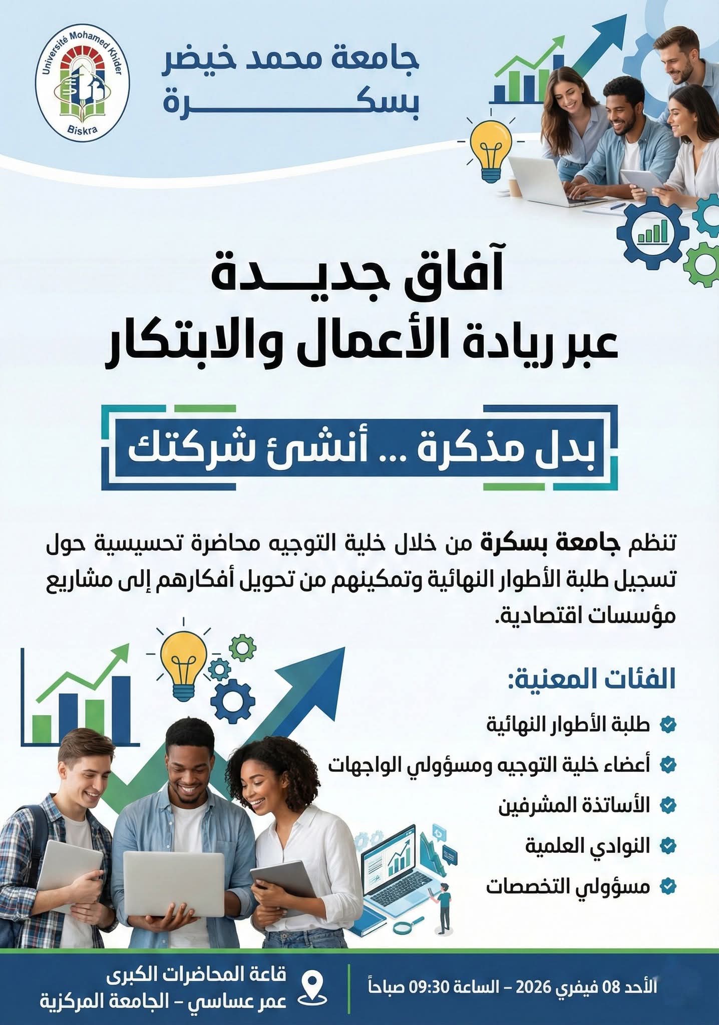 1000012850تنظم جامعة بسكرة من خلال خلية التوجيه محاضرة تحسيسية حول تسجيل طلبة الأطوار النهائية وتمكينهم من تحويل افكارهم إلى مشاريع مؤسسات اقتصادية